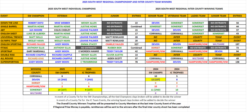 | In event of a County Tie for the SW Championships, all the tied Champions clays broken will be added to decide the winner | ||||||||||
