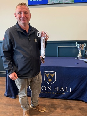 Here is Chris Daniels picking up the trophy for his AA Class win at the CPSA English Open English Sporting 2021 at Barbury Shooting School.