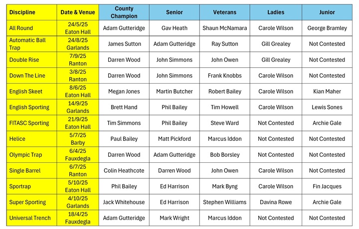 In the event of a tie in Staffordshire County Championship events, the winner will be determined by a shoot-off. This applies across all Categories. The exact nature of the shoot-off will be determined and advertised in advance of each discipline-specific Championship.